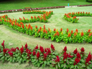 羽毛ケイトウはヒユ科ケイトウ属のふさふさした円錐形の柔らかな花穂が特徴の一年草の園芸種です。ケイトウはインドからアフリカが原産でニワトリのトサカのような花穂から鶏頭(ケイトウ)と呼ばれています。黄色、オレンジ色、緋色の株が芝生に映えて奇麗です。(撮影日:2024年9月25日撮影)